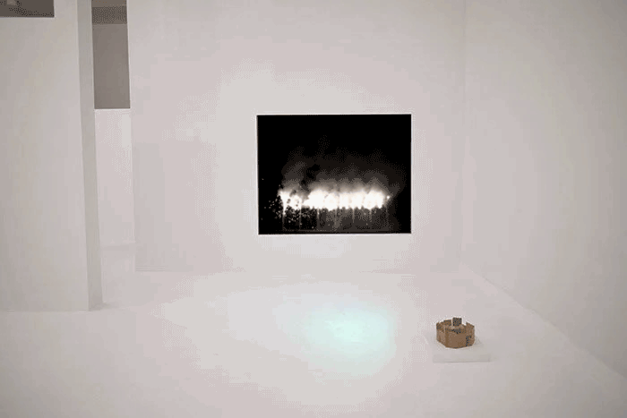 Captured in HD video and sound, TO-MORROW (to manifest) presents the scene of a natural tree line silhouetted against an open night sky. The setting, once the site of an 1860s homestead, was loosely inspired by the 19th-century depictions of romantic landscapes painted to promote the westward expansion of the United States. In the video, the natural scene is abruptly erased by the spectacle of a firework sign spelling out TO-MORROW. The landscape eventually reemerges from the smoke, but now in a more fragile and thus accurate representation of itself.